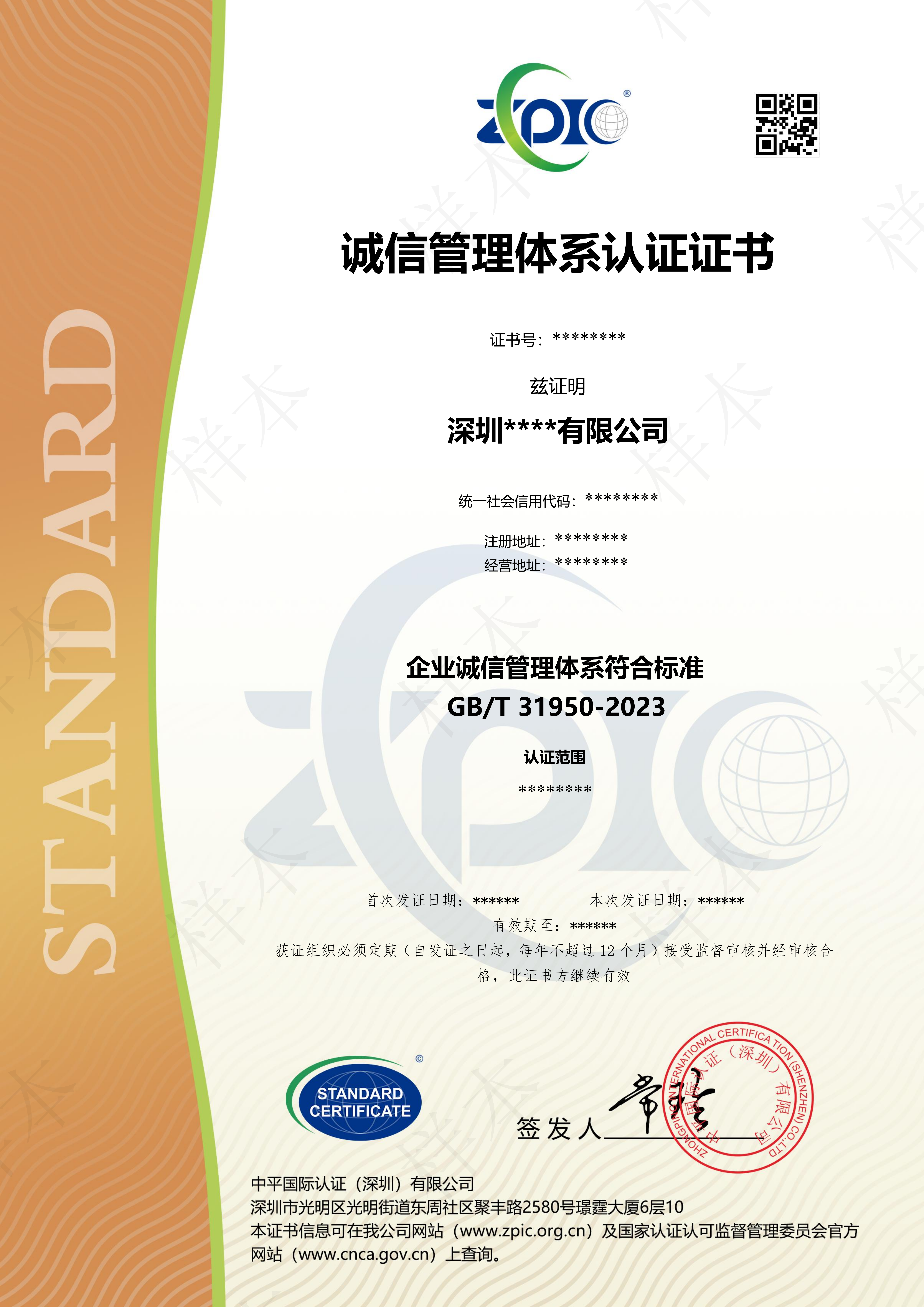 诚信管理认证证书-中文