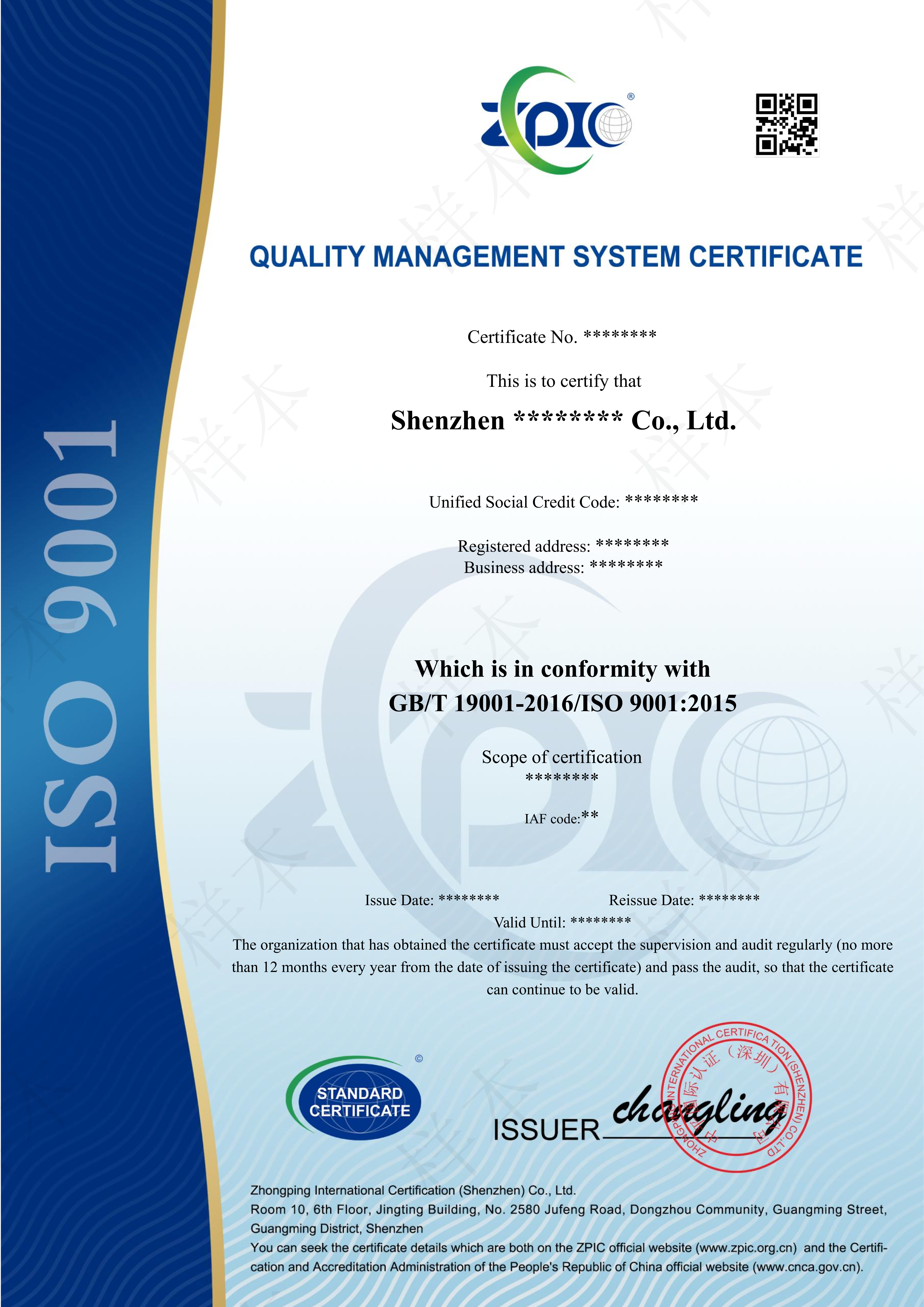 质量体系认证证书-ZPIC中文