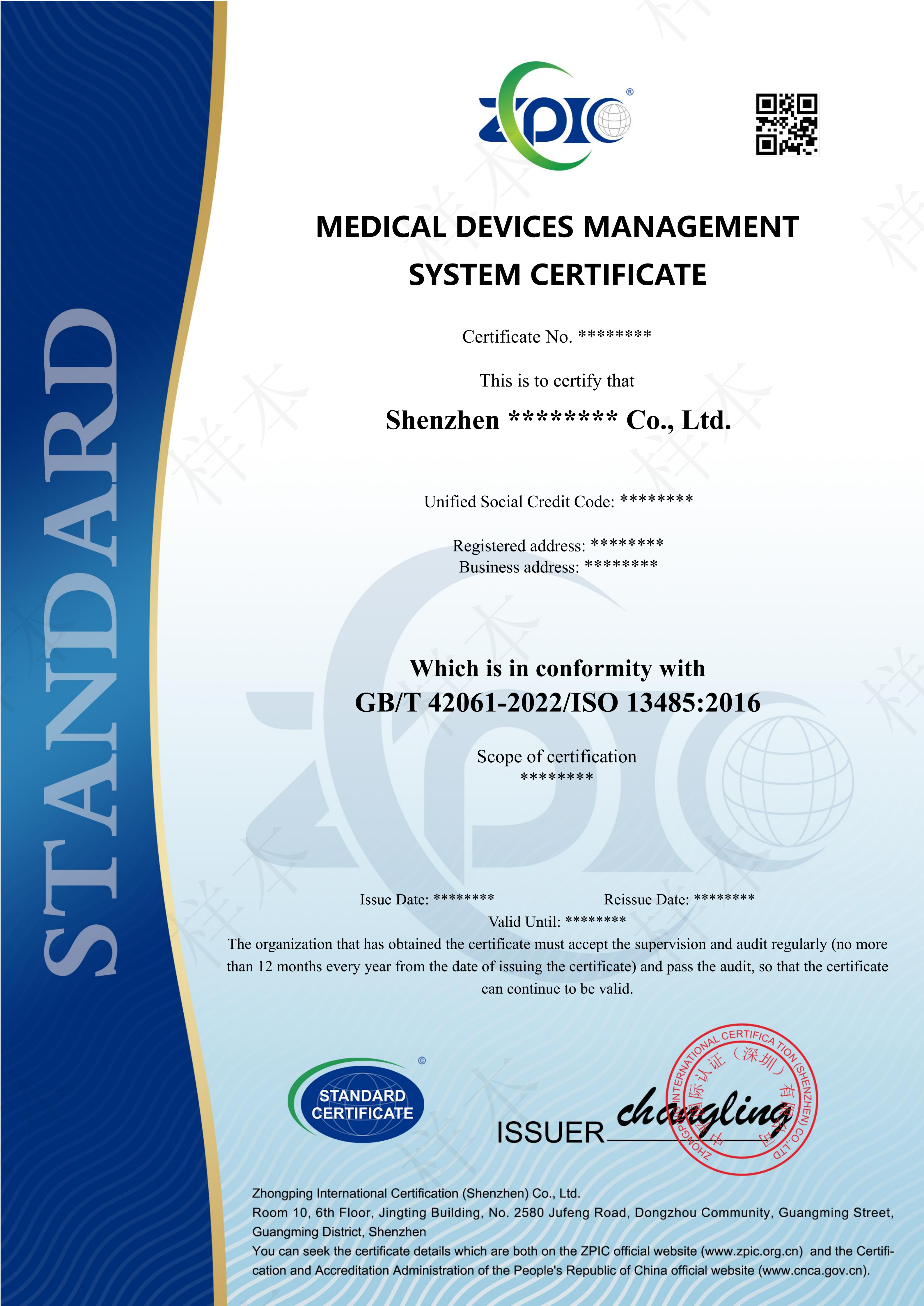 医疗器械体系认证证书-英文